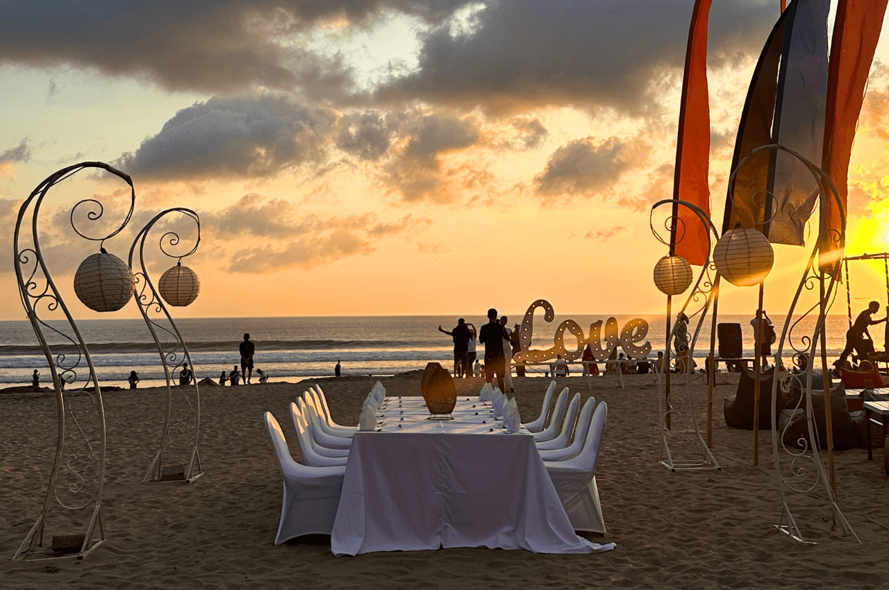 告別峇里島前的最後一晚,我們在絕美的海景日落陪伴下、聽著現場樂隊的演奏,一起享用海鮮大餐,聆聽壯闊大海的海浪聲,橘紅色的夕陽沾染在白色的桌布上,享受悠閒自適的海景晚餐。 -