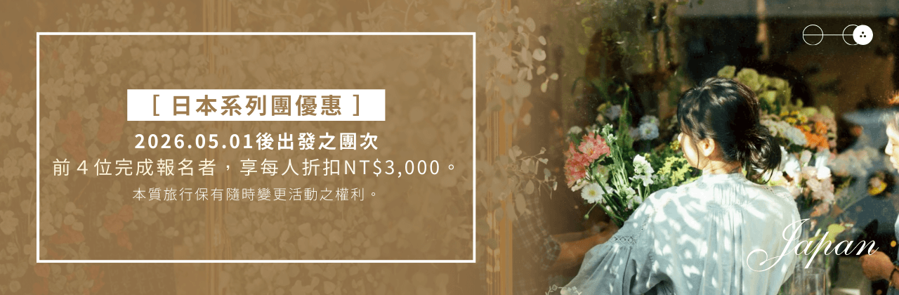 ▶︎2026.05.01後出發之團次,前4位完成報名者,每人折扣NT$3,000元。