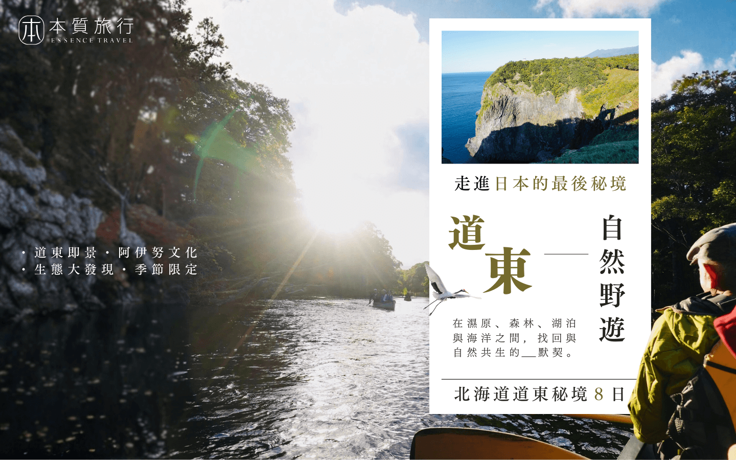 我們將在此趟北海道道東之旅中,以不追趕的步調走訪「釧路濕原」、「阿寒湖」、「屈斜路湖」、「層雲峽」,與北海道唯一的世界自然遺產之地「知床」。住進令人心曠神怡的風景裡,透過專業引導認識道東的自然生態,也循著歷史脈絡,瞭解北海道原住民「阿伊努人」與土地之間的生活軌跡。