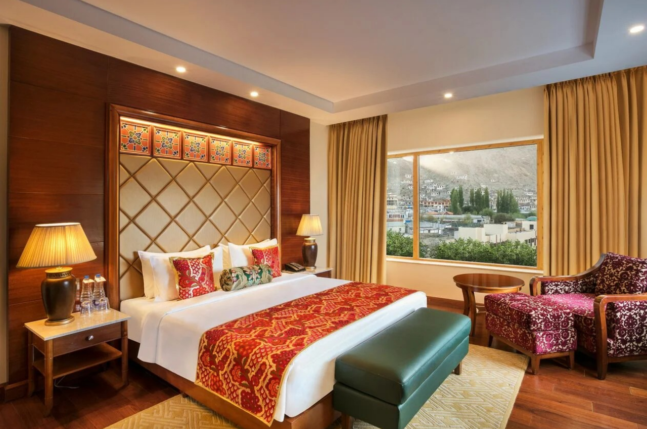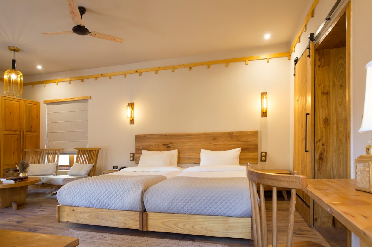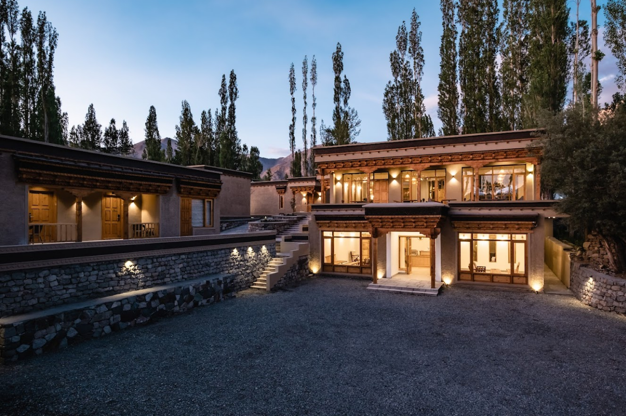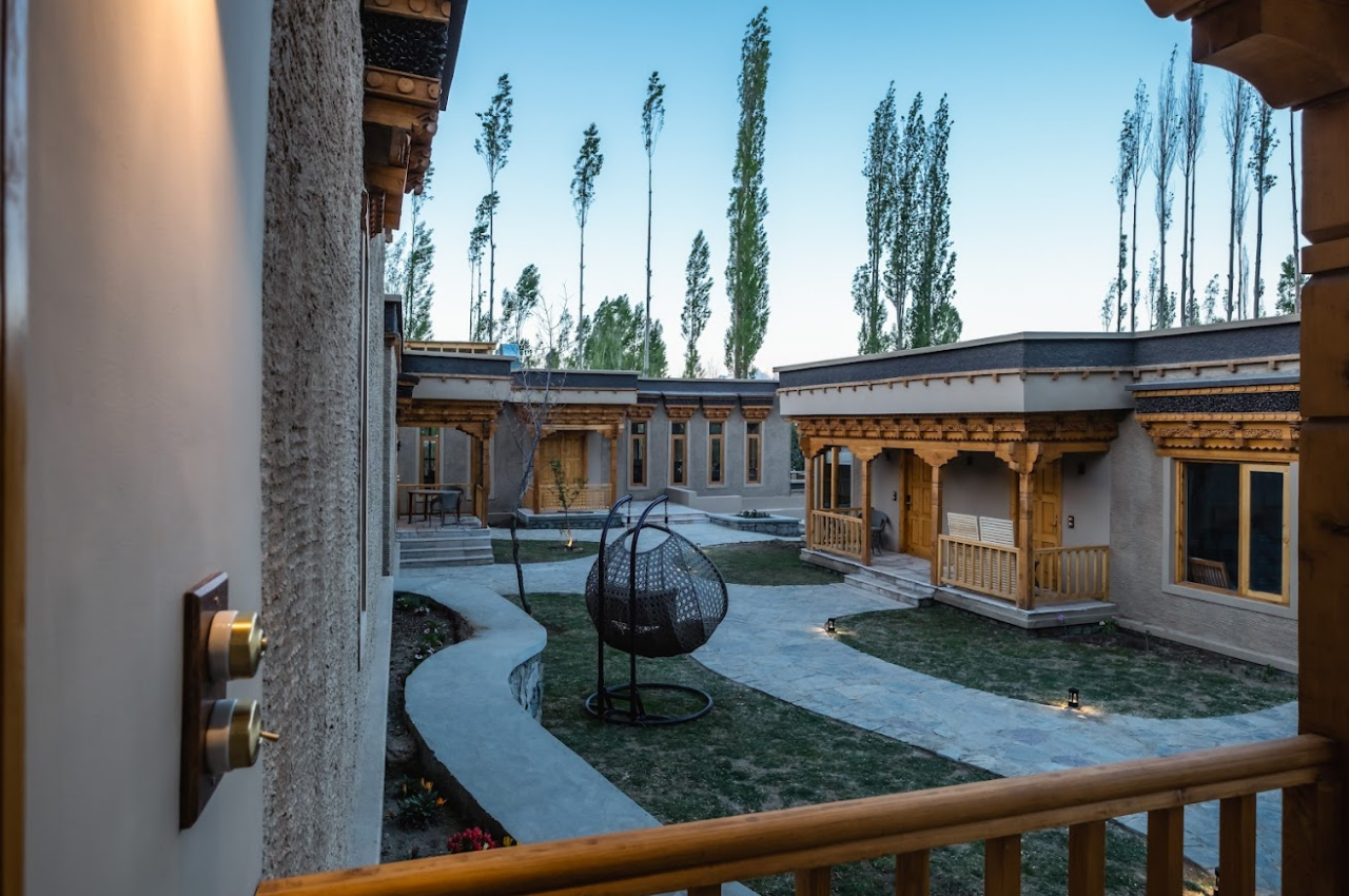 歷史與現代的設計—拱形窗框、雕刻木門體現拉達克傳統建築的文化特色,搭配運用當地天然建材(如石塊、竹子、木頭)大地色調的軟裝,不僅創造溫暖放鬆的住宿氛圍,也減少對生態的耗損,讓觀光與永續平衡,讓旅人身處與自然共生的空間。